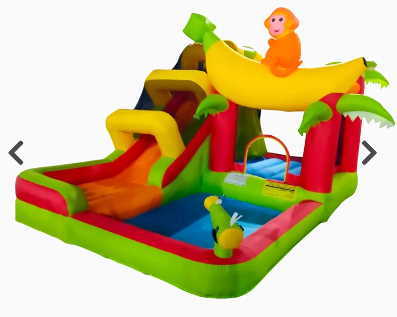 - • מתקן שעשועים מתנפח לילדים הכולל אזור בריכת פעילות מים, תותח מים, אזור קפיצה בעל קירות רשת שמתוכה מטפסים למגלשה.